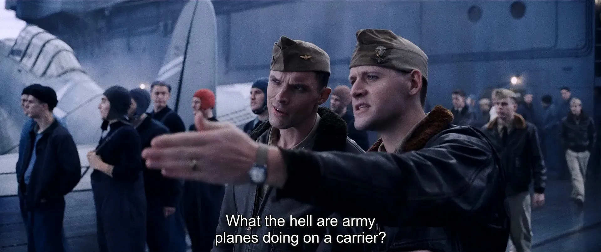 Starring: Ed Skrein as Lieutenant Richard 'Dick' Best, Patrick Wilson as Rear Admiral Edwin T. Layton, Woody Harrelson as Admiral Chester W. Nimitz, Luke Evans as Commander Wade McClusky, Mandy Moore as Anne Best, Luke Kleintank as Lieutenant Clarence Earle Dickinson, Dennis Quaid as Vice Admiral William 'Bull' Halsey, Aaron Eckhart as Lieutenant Colonel Jimmy Doolittle, Keean Johnson as Chief Aviation Radioman James Murray, Nick Jonas as Bruno Gaido, Etsushi Toyokawa as Admiral Isoroku Yamamoto, Tadanobu Asano as Rear Admiral Tamon Yamaguchi, Darren Criss as Commander Eugene Lindsey, Brandon Sklenar as George 'Tex' Gay, Jake Manley as Willie West, Jun Kunimura as Vice Admiral Chūichi Nagumo, Nobuya Shimamoto as Captain Tomeo Kaku, Brennan Brown as Commander Joseph Rochefort, Jake Weber as Rear Admiral Raymond Spruance, Alexander Ludwig as Lieutenant Roy Pearce, David Hewlett as Husband Kimmel, Mark Rolston as Ernest King, Eric Davis as Captain Miles Browning, Kenny Leu as Zhu Xuesan, Rachael Perrell Fosket as Dagne Layton, Peter Shinkoda as Cmdr. Minoru Genda, James Carpinello as William Brockman, Tim Beckmann as Captain Rawlings, Sarah Halford as Marie Pearce, Cameron Brodeur as Sully Brown, Hiromoto Ida as Prime Minister Tojo, Hiroaki Shintani as Emperor Hirohito, Russell Dennis Lewis as Ensigh O’Flaherty, Geoffrey Blake as John Ford, Mikaël Conde as Bill Miller, Madison Roukema as Barbara Best, Christie Brooke as Millicent McClusky, Dustin Geiger as Paul Crosley, Jason Lee Hoy as Pat Rooney, Ellen Dubin as Admiral King Secretary, Jason New as Marine Captain (Midway), Dean Schaller as Jack MacKenzie Jr., Jacob Blair as Hank Potter, Kayo Yasuhara as Geisha, Rudolph Wallstrom as Petty Officer (Pacific HQ), Matthew MacCaull as Staff Officer (Nimitz), Philip Fu-Kang Wang as Chinese Major, Johan Strombergsson-Denora as Radioman #1 (Enterprise SC), Nico DeCastris as Radioman #2 (Enterprise SC), Alexandre Dubois as Radar Officer (Enterprise), Tyler Elliot Burke as Radar Officer (Enterprise), Raphael Grosz-Harvey as Lt. JG (Hospital), Trevor Danielson as Talker, Agostino Michael Cimino as Buzz Davis (Sonar Tech Nautilus), Takeshi Kurokawa as Imperial Guardsman, Ryuta Kato as Japanese Junior Officer (Yamat), Garret Sato as Japanese Officer (Prison), Neil Girvan as Navy Yard Inspector, Ellis Arch as Lofton Henderson, Robert Crooks as McClusky's Radioman, Sean Colby as Gay's Radioman, Kasey Ryne Mazak as Signal Officer (Akagi), Ryo Hayashida as Deck Officer (Akagi), Michael Chapman as Helmsman (Nautilus), Masahiro Tanikawa Masa Tani as Damage Control Officer, Ryohei Arima as Japanese Lieutenant (Kaga), Hiro Kanagawa as Makigumo Captain, Ken Takikawa as Makigumo Lieutenant, Leonardo Boudreau as Passing Sailor, Tony Christopher as SBD Pilot (Enterprise), Yuta Takenaka as Staff Officer (Yamato), Tatsuya Shirato as Flag Officer (Yamato), Tyler Hall as William 'Slim' Townsend, Kyle Bougeno as Smoking Sailor, David Dacosta as Breathless Ensign (Enterprise), Kazuki Gonzalez-Adachi as Hiryu Helmsman, Reyn Halford as Torpedo Room Chief, Toyoaki Ito Leung as Japanese Boy (10 YO), Halta Nonen as Japanese Boy #2 (6 YO), Adrian Spencer as Chief Medic (Enterprise), James Hicks as Edwin Kroeger, Sebastian Pigott as Petty Officer #2, Simon Pelletier-Gilbert as Yorktown Spotter, Philippe Verville as Doolittle's Bombardier, Shigeru Yabuta as Japanese Duck Netting Officer, Seunghwan Min as Zero Pilots Squadron Leader, Christopher Tapia as Hiryu Pointer, Sangwon Jun as Hiryu Talker, Motoo Taira as Akagi Spotter, Ana Maria Lombo as Ballroom Singer